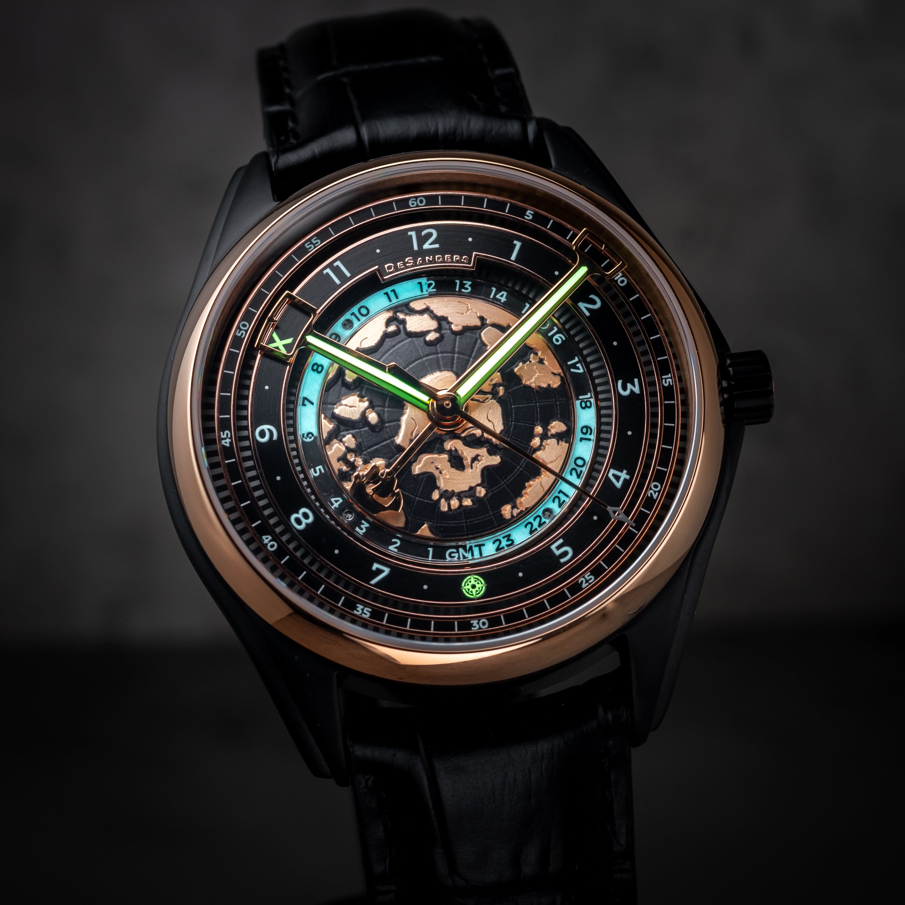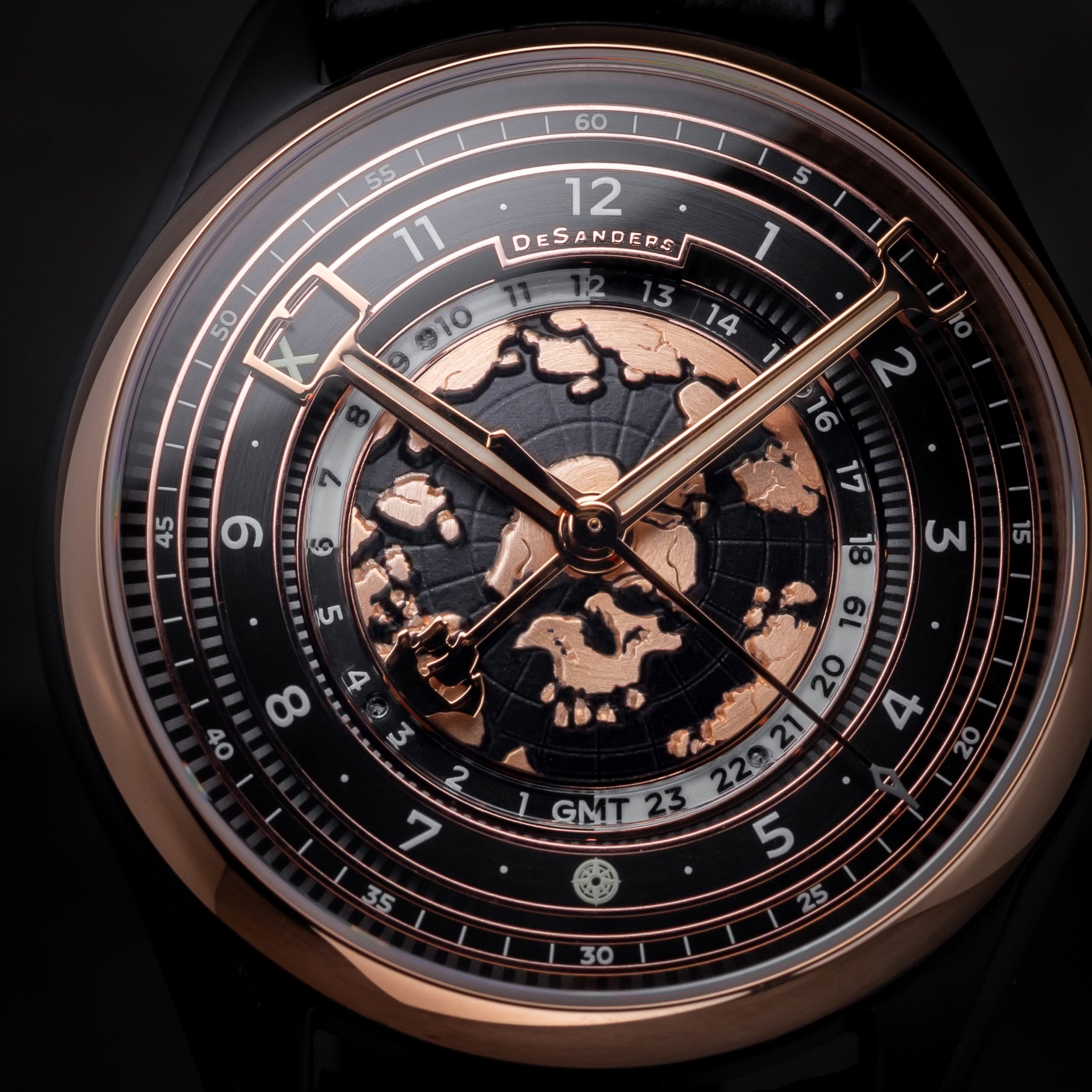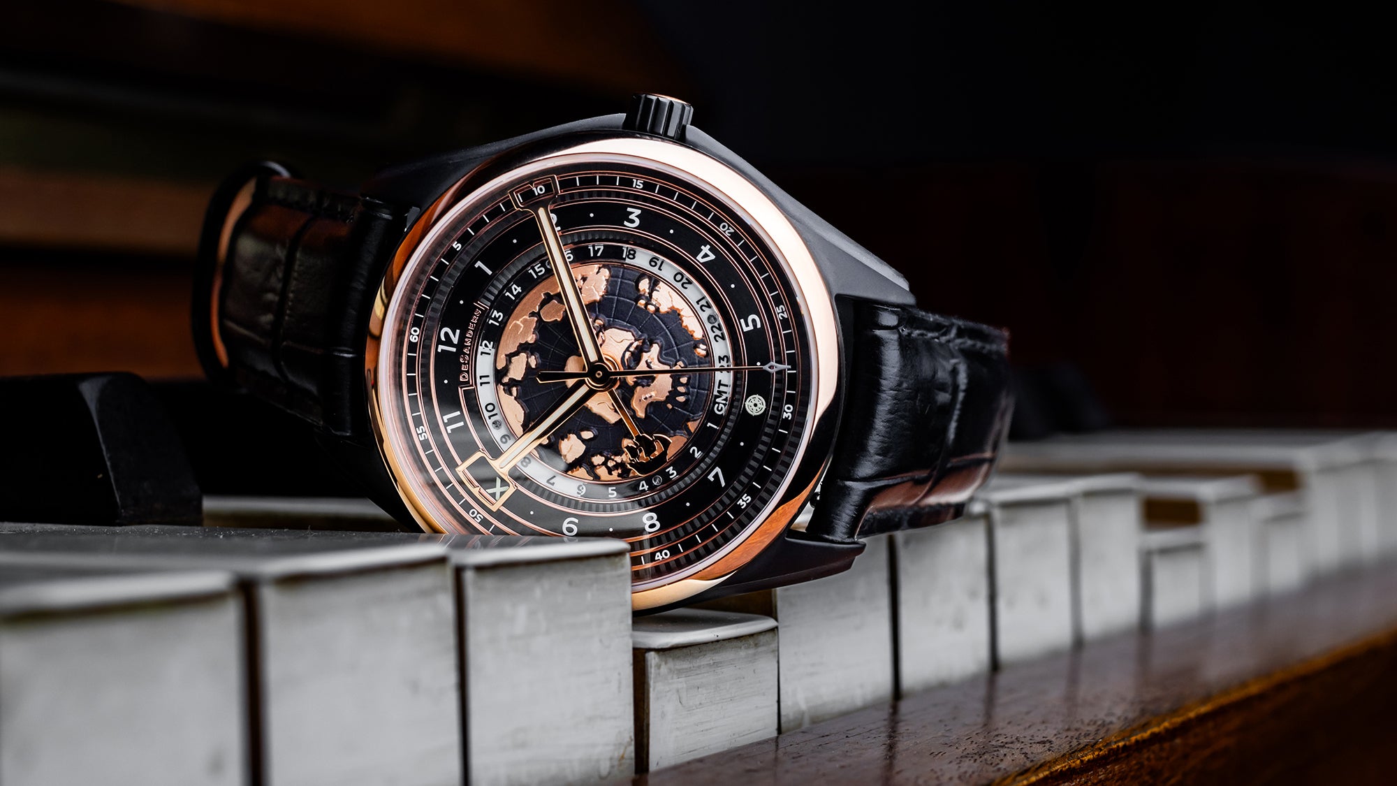 Circling around the globe is the custom sail ship GMT pointer, combined with a GMT ring with a twist.